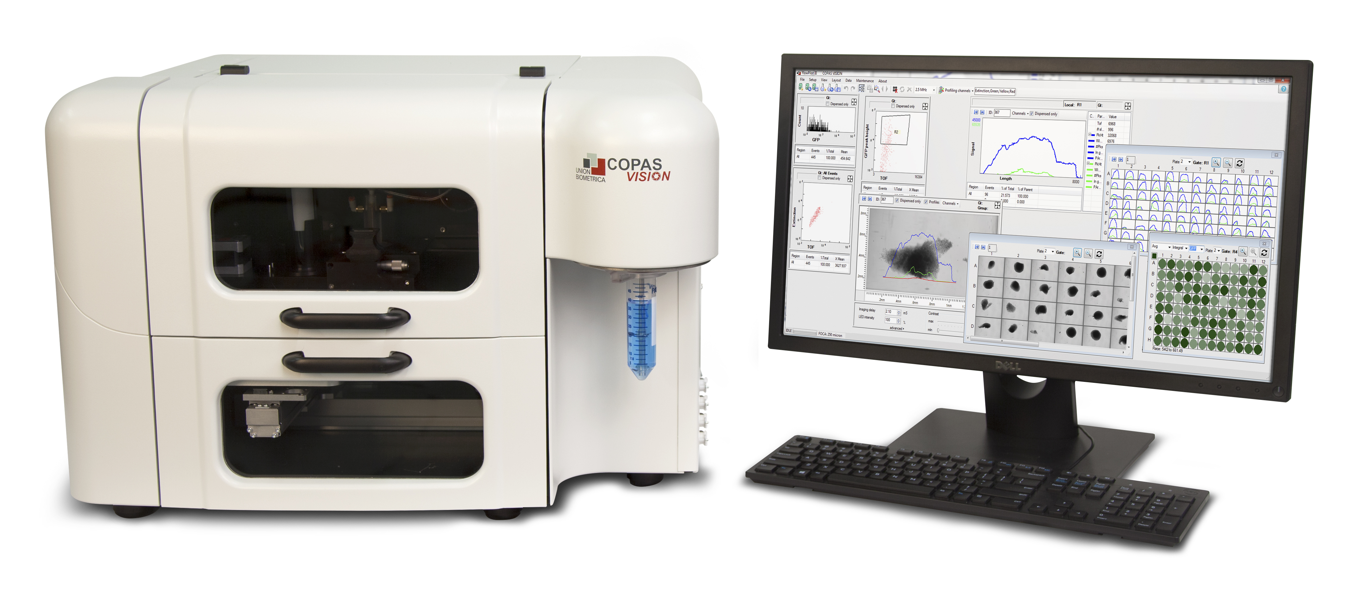As a third platform, we have introduced the new COPAS VISION family of instruments which expand our traditional large particle analysis and sorting capabilities with the addition of real-time, on-line brightfield imaging. Those images can help you quickly identify what objects are in a particular gate region, analyze concentration in a well, and observe sample morphology. In addition the COPAS VISION is built upon our next generation optics and electronics for the highest sensitivity data collection we offer.